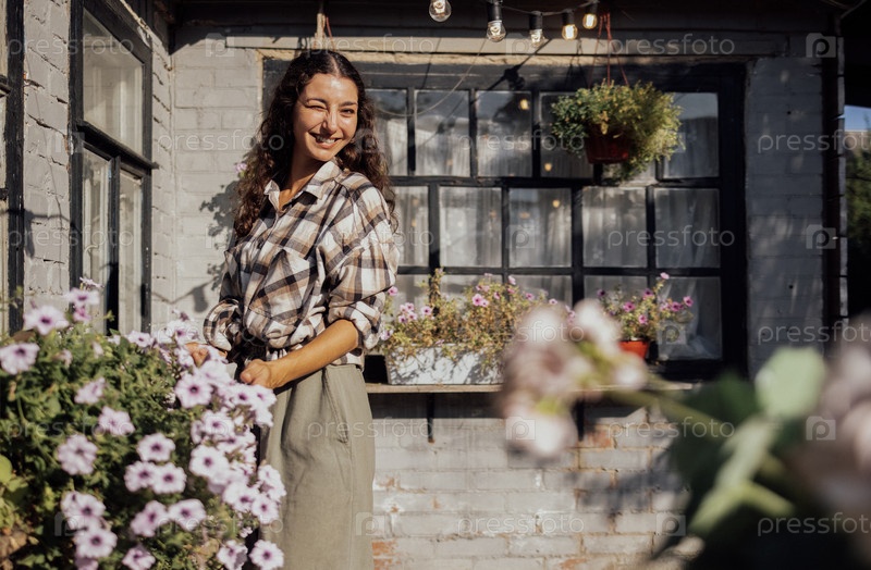 Портрет молодой очаровательной женщины в повседневной одежде, подмигивающей и улыбающейся на открытом воздухе. Кудрявая привлекательная девушка-садовница ухаживает за цветами на заднем дворе