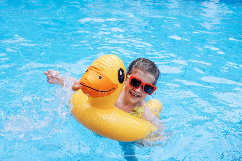 Маленькая смеющаяся милая девочка в солнечных очках плавает в отеле с бассейном или у себя дома. Довольно счастливая девочка улыбается и плывет вместе с надувным желтым кругом в форме утки. Прекрасный ребенок веселится на каникулах
