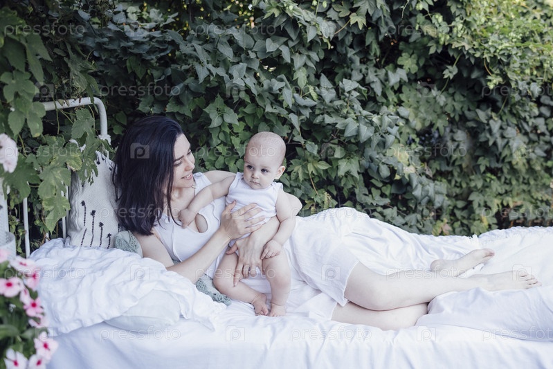 Молодая красивая женщина в белой одежде лежит на кровати с ребенком на открытом воздухе