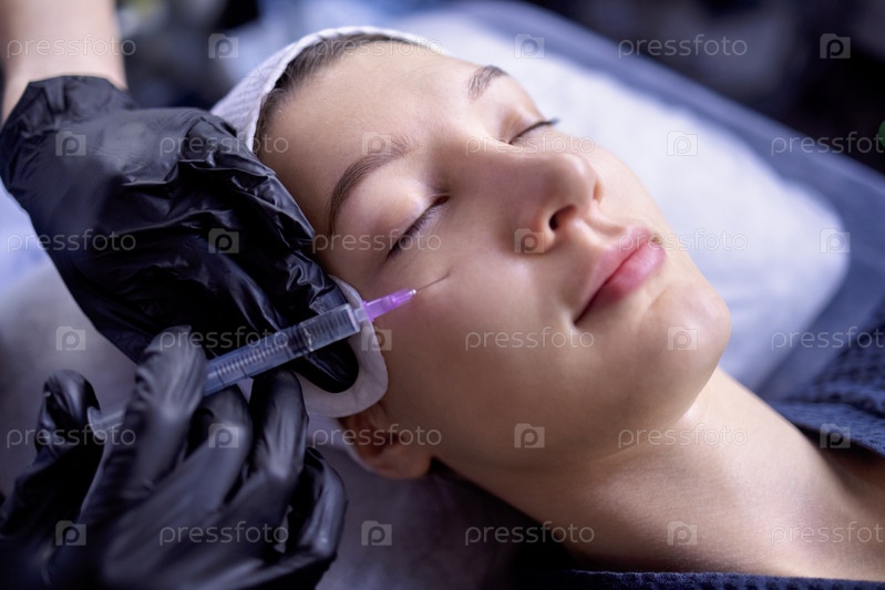 Инъекции красоты. Женщина-косметолог в черных перчатках делает инъекцию