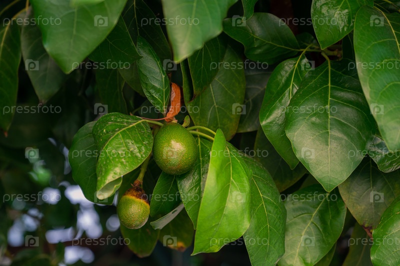 Плоды авокадо на дереве авокадо в саду