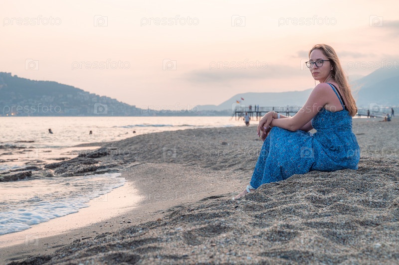 Женщина сидит на пляже и смотрит на море в городе Алания