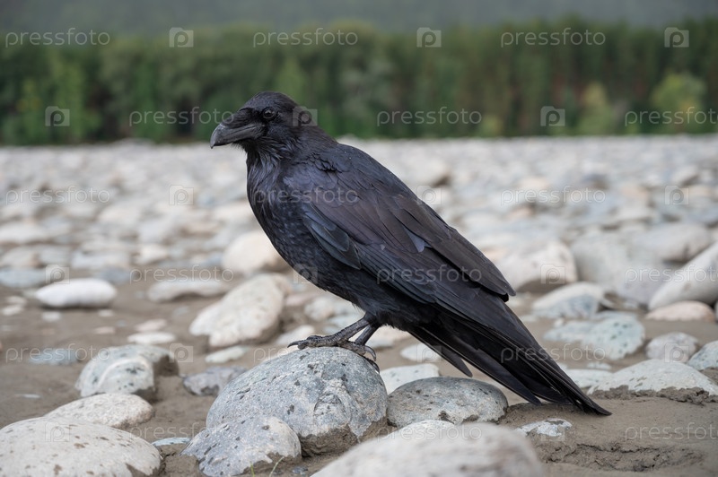 Черная птица-ворон сидит на камне