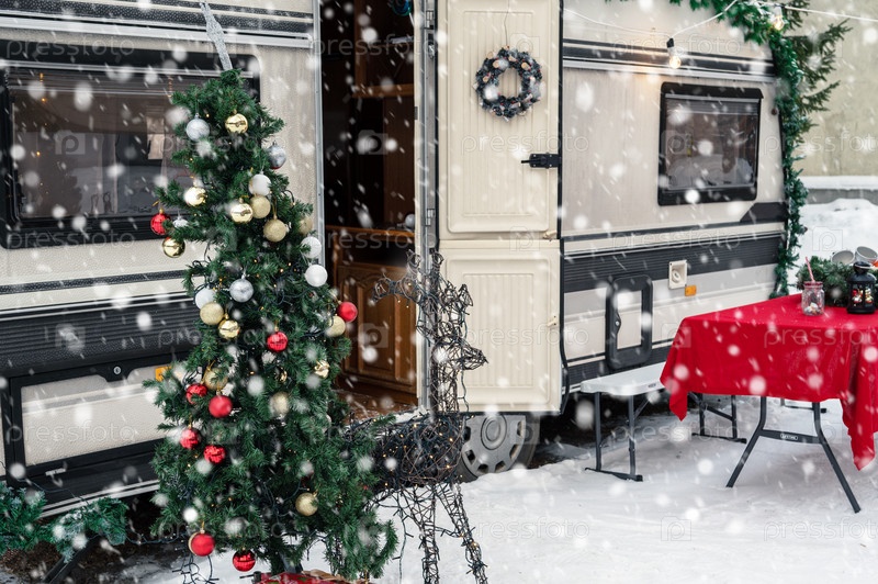 Современный дом на колесах в зимнем кемпинге, украшенный к Рождеству или Новому году