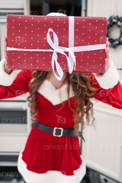 Красавица в костюме Санты с подарочной коробкой в зимнем кемпинге готовится к Новому году. Концепция празднования Нового года