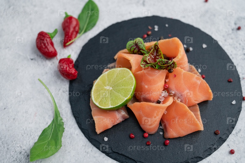 Ломтики свежего лосося с перцем, зеленью и лаймом на бетонном фоне