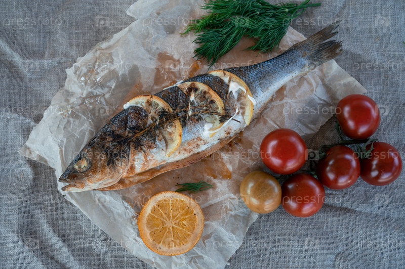 Аппетитная рыба сибас с зеленью и овощами. На деревянном фоне