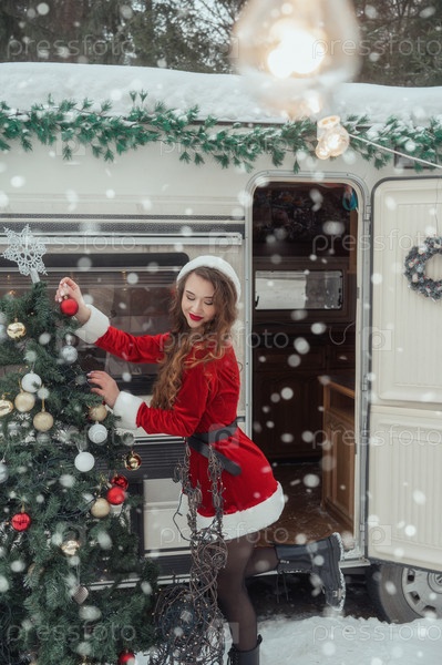 Молодая женщина в костюме Санты украшает елку в зимнем кемпинге, готовясь к Новому году. Концепция празднования Нового года
