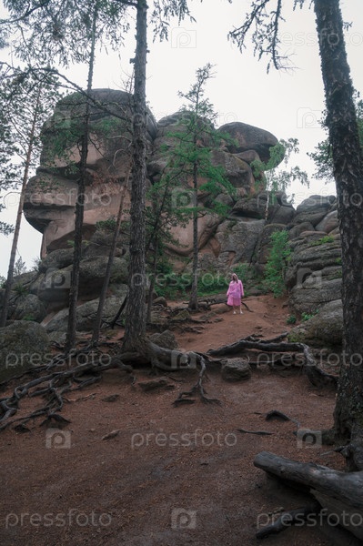 Женщина в плаще в тайге и скалах заповедника Столбы, Красноярск, Россия