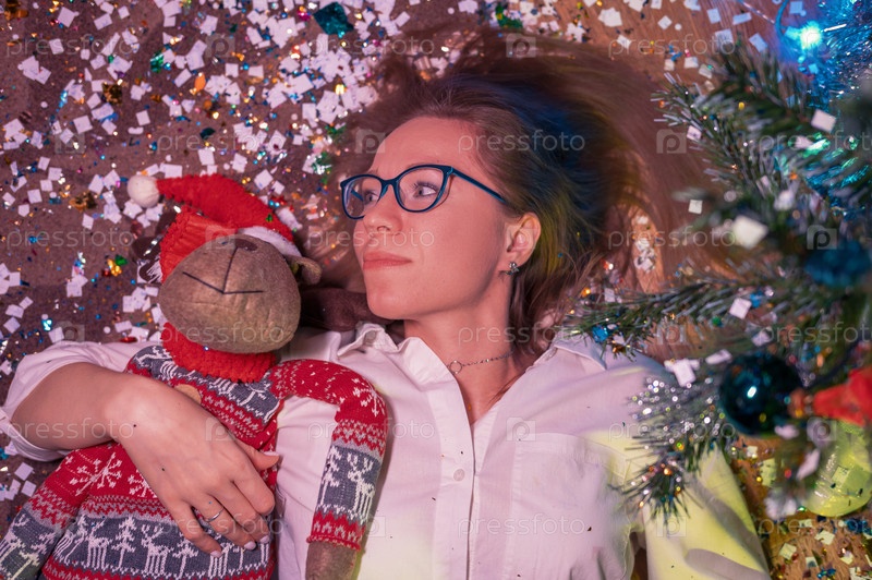 Счастливая улыбающаяся женщина лежит на полу и празднует Новый год