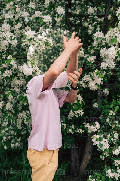 Творческий мужской портрет с зеркалом в весеннем саду цветущих яблок