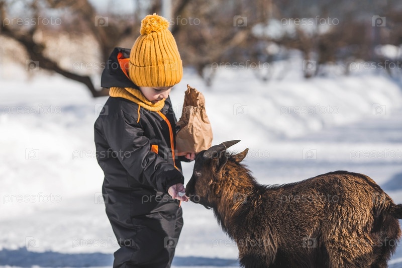 Маленький мальчик кормит козочку на ранчо, на частной экоферме или в контактном зоопарке. Ребенок ласкает животных в зоопарке. Выходные с семьей