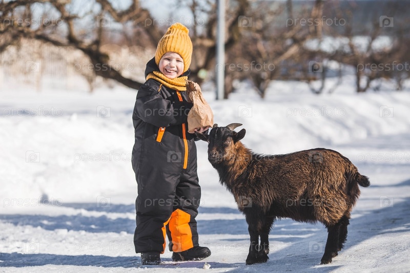 Маленький мальчик кормит козочку на ранчо, на частной экоферме или в контактном зоопарке. Ребенок ласкает животных в зоопарке. Выходные с семьей