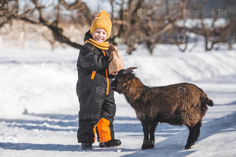 Маленький мальчик кормит козочку на ранчо, на частной экоферме или в контактном зоопарке. Ребенок ласкает животных в зоопарке. Выходные с семьей