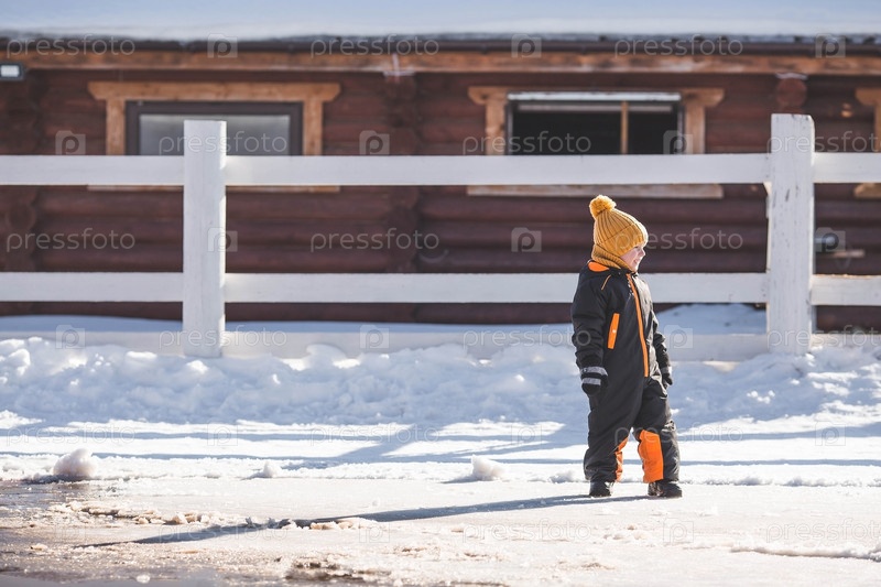 Портрет маленького мальчика в желтой шляпе. Ребенок бегает по лужам на ферме, веселится и играет. Сегодня солнечный день. Ранняя весна. Первая капля