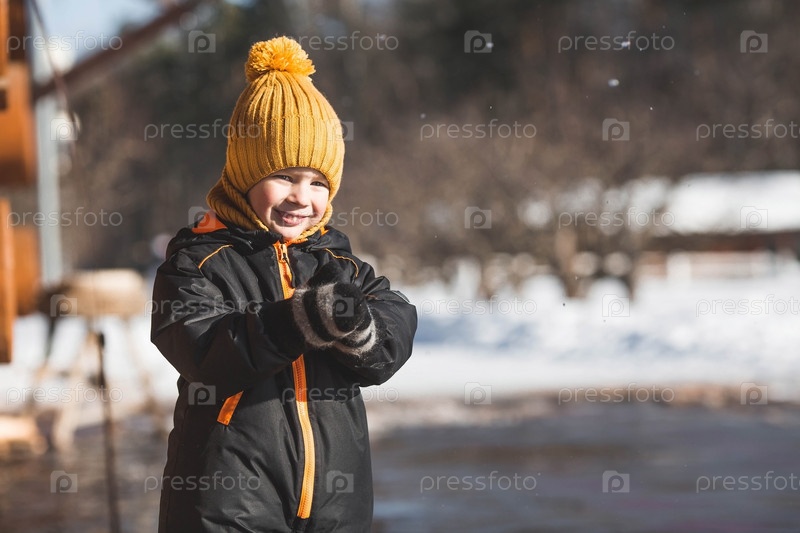 Портрет маленького мальчика в желтой шляпе. Ребенок бегает по лужам на ферме, веселится и играет. Сегодня солнечный день. Ранняя весна. Первая капля