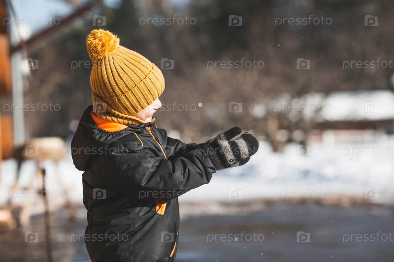 Портрет маленького мальчика в желтой шляпе. Ребенок бегает по лужам на ферме, веселится и играет. Сегодня солнечный день. Ранняя весна. Первая капля