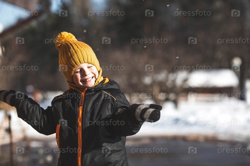 Портрет маленького мальчика в желтой шляпе. Ребенок бегает по лужам на ферме, веселится и играет. Сегодня солнечный день. Ранняя весна. Первая капля