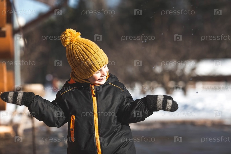 Портрет маленького мальчика в желтой шляпе. Ребенок бегает по лужам на ферме, веселится и играет. Сегодня солнечный день. Ранняя весна. Первая капля