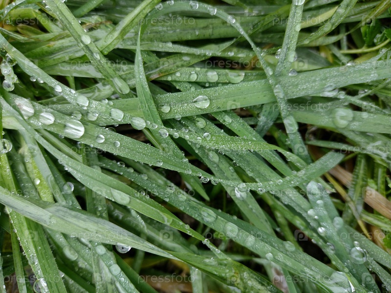 Весенний фон. Сочная пышная зеленая трава на лугу с каплями
