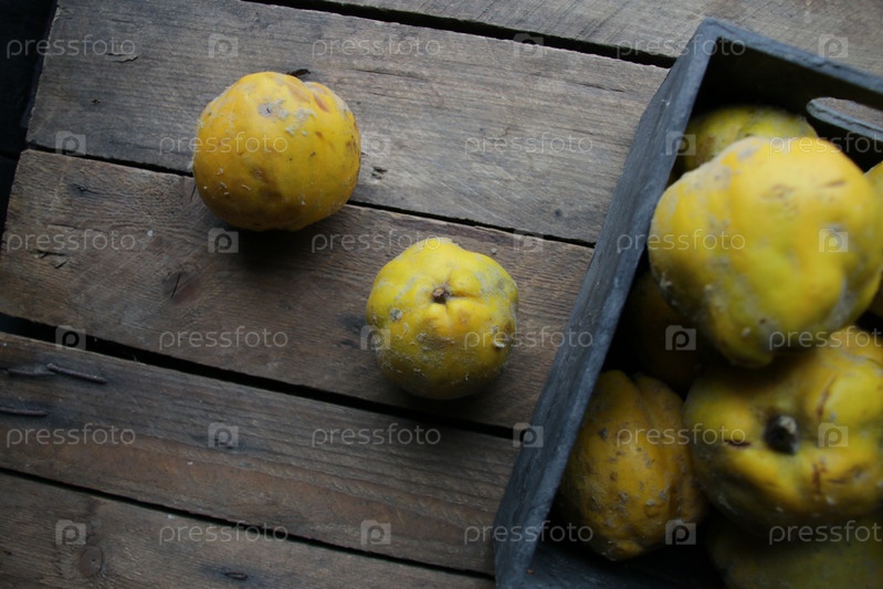 Свежие спелые органические айвы в коробке на деревянном столе