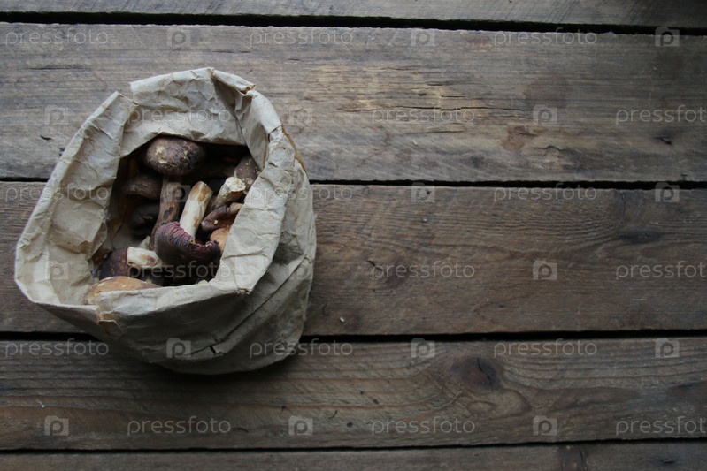 Грибы в бумажном пакете на старинном столе. Фон меню