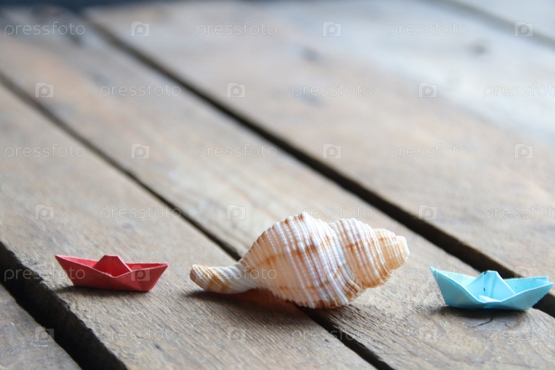 Летний фон. Ракушка на деревянном фоне