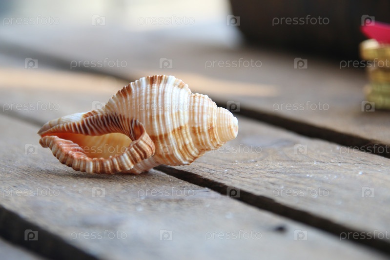 Ракушка на деревянном фоне. Концепция летнего времени