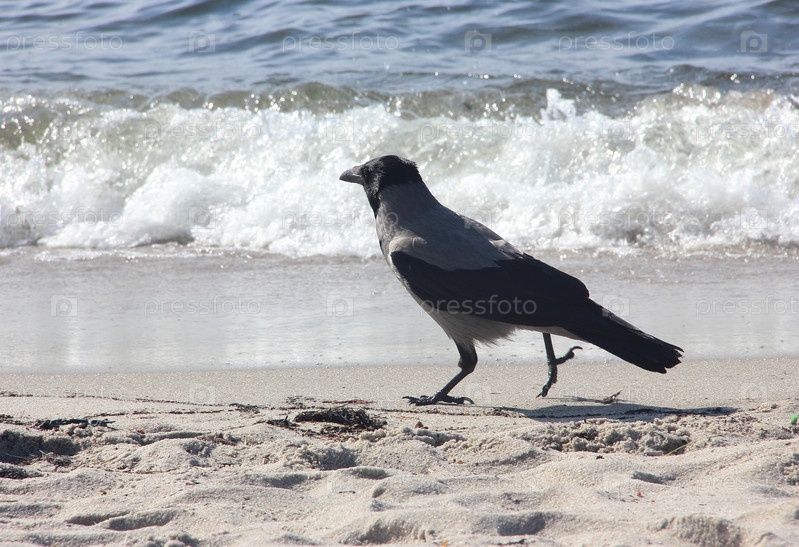 Ворона прогуливается по песку на пляже рядом с морем.серая ворона