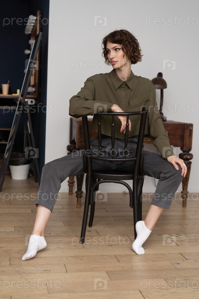 Молодая красивая женщина позирует в зеленой рубашке в студии