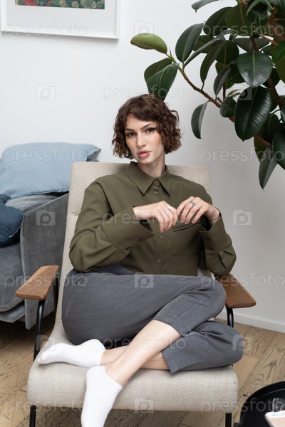 Молодая красивая женщина позирует в зеленой рубашке в студии