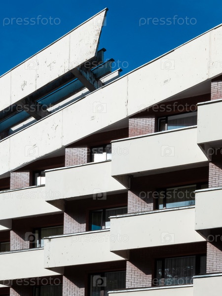 Фасад здания санатория с геометричными балконами в силе советского конструктивизма на фоне синего неба летом