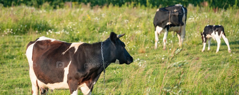 Коровы пасутся на сочном лугу в летний день