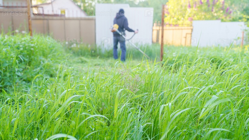Мужчина косит траву триммером, фокусируется на размытом фоне переднего плана