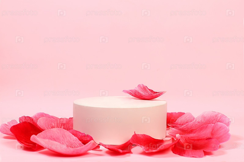 Абстрактный элегантный фон со светлым подиумом, пионами и лепестками роз, минимальная цветочная композиция, пустая витрина для демонстрации или презентации косметических продуктов, концепция натуральных продуктов,