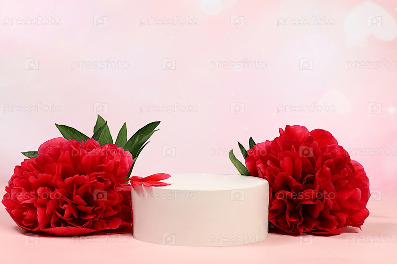 Абстрактный элегантный фон со светлым подиумом и цветами пионов, минимальная цветочная композиция, пустая витрина для демонстрации или презентации косметической продукции, концепция натуральных продуктов,