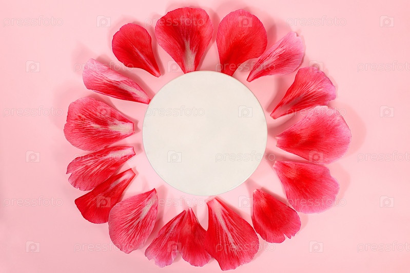 Абстрактный элегантный фон со светлым подиумом, пионами и лепестками роз, минимальная цветочная композиция, пустая витрина для демонстрации или презентации косметической продукции, концепция натуральных продуктов, избирательный фокус