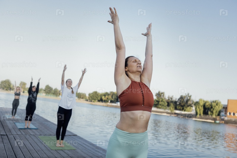 Утреннее занятие йогой с инструктором на пристани города. Молодые женщины стоят, подняв руки на коврики, и выполняют упражнения