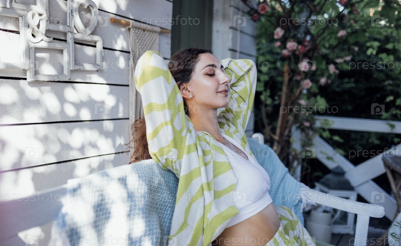 Молодая женщина сидит и расслабляется, заложив руки за спину и закрыв глаза на открытой веранде. Милая кудрявая девушка отдыхает на деревянной скамейке на заднем дворе дома