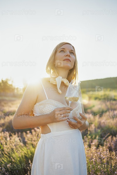 Молодая блондинка в белом платье и соломенной шляпе держит бокал вина на лавандовом поле