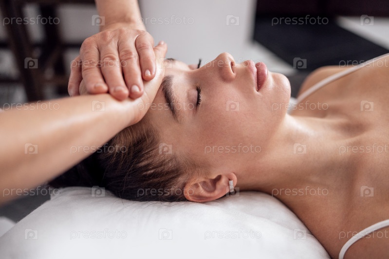 Брюнетка закрыла глаза и наслаждается спа-процедурой в салоне красоты