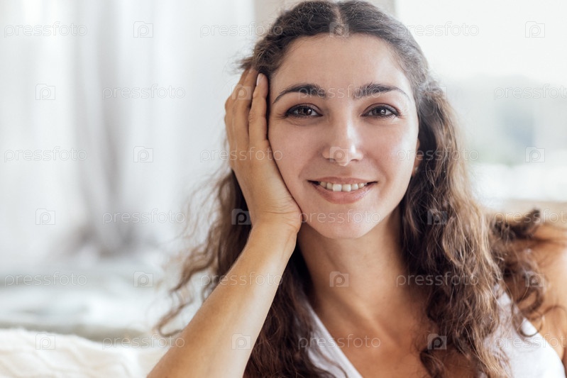 Крупный план женского портрета очаровательной кудрявой молодой женщины. Привлекательная брюнетка в белой одежде улыбается