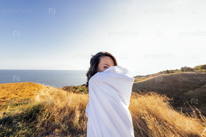 Молодая привлекательная азиатка, завернутая в белое одеяло, смотрит в камеру и наслаждается горами и морем