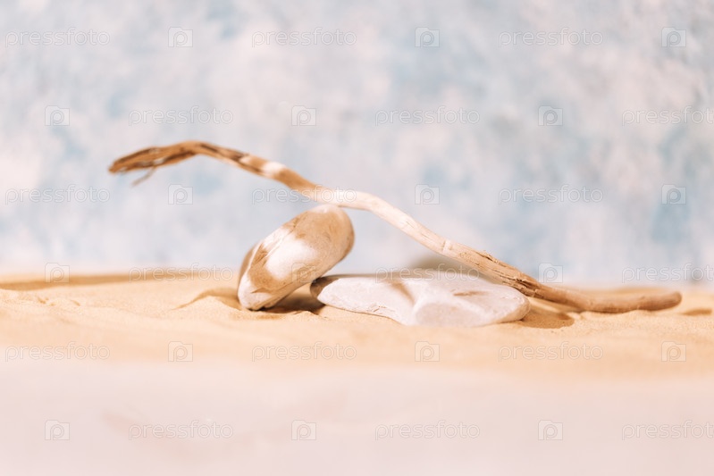 Сцена для косметической косметики с текстурированными камнями и веткой дерева