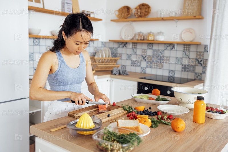 Молодая привлекательная азиатка готовит вкусный сэндвич с рыбой и авокадо