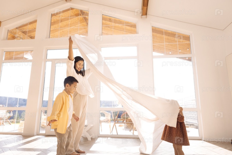 Молодая азиатка играет дома со своими милыми детьми. Смеющаяся мама веселится со своим маленьким сыном и дочерью в гостиной