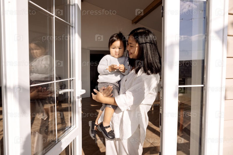 Молодая красивая азиатка держит на руках свою милую маленькую дочь. Корейская мать с ребенком выходят из дверей дома на террасу
