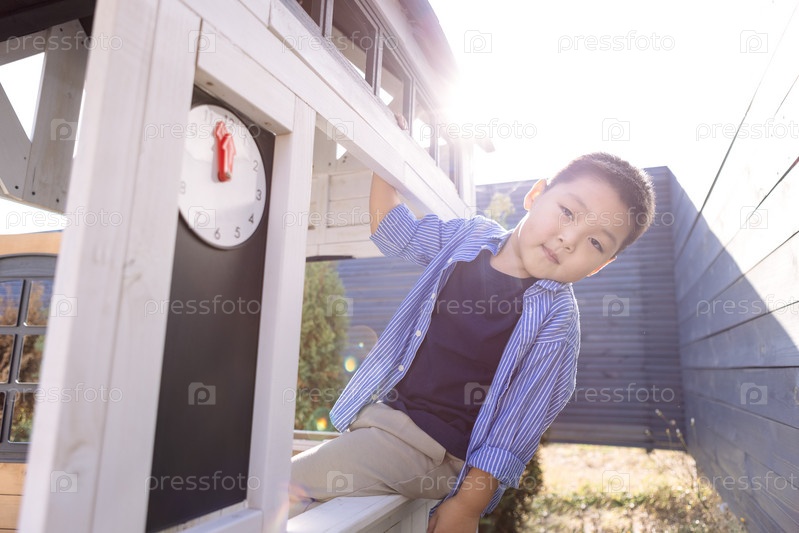 Азиатский мальчик выглядывает из детского деревянного домика. Корейский ребенок играет на заднем дворе