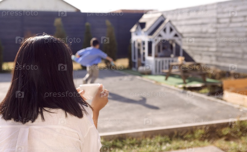 Азиатская мама держит чашку и пьет чай на заднем дворе дома. Молодая женщина присматривает за сыном в саду