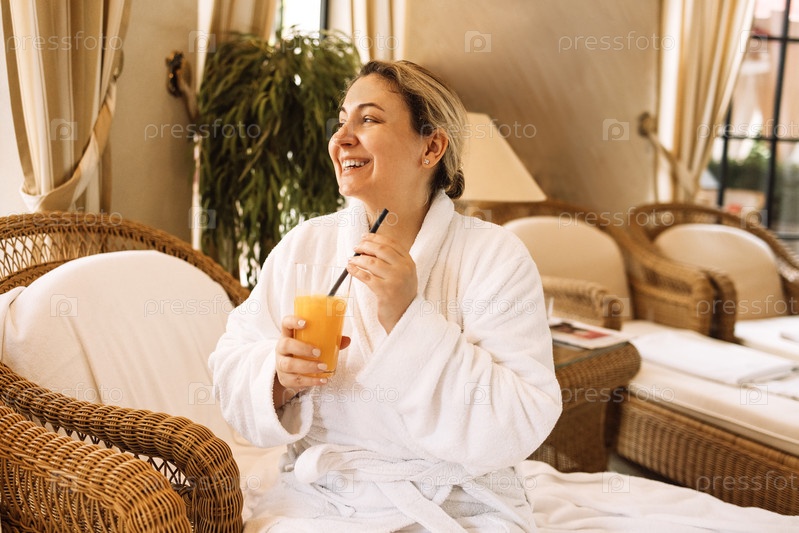 Молодая женщина в белом халате смеется и сидит в плетеном кресле в спа-салоне. Очаровательная девушка пьет апельсиновый сок и наслаждается отдыхом в отеле